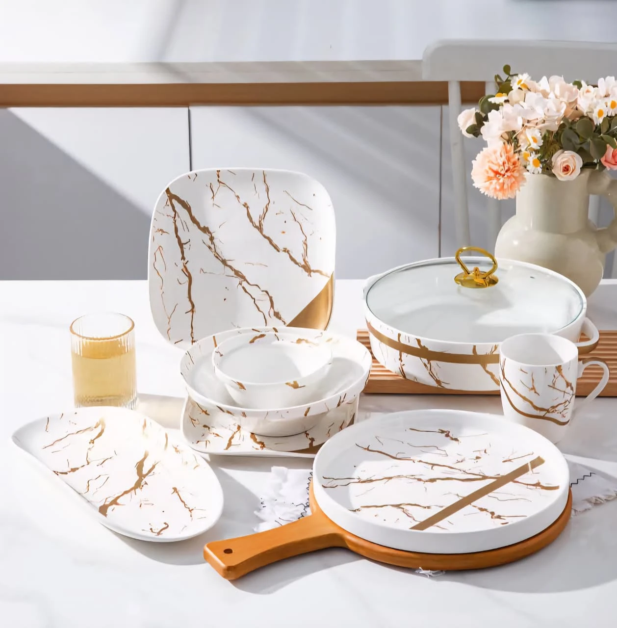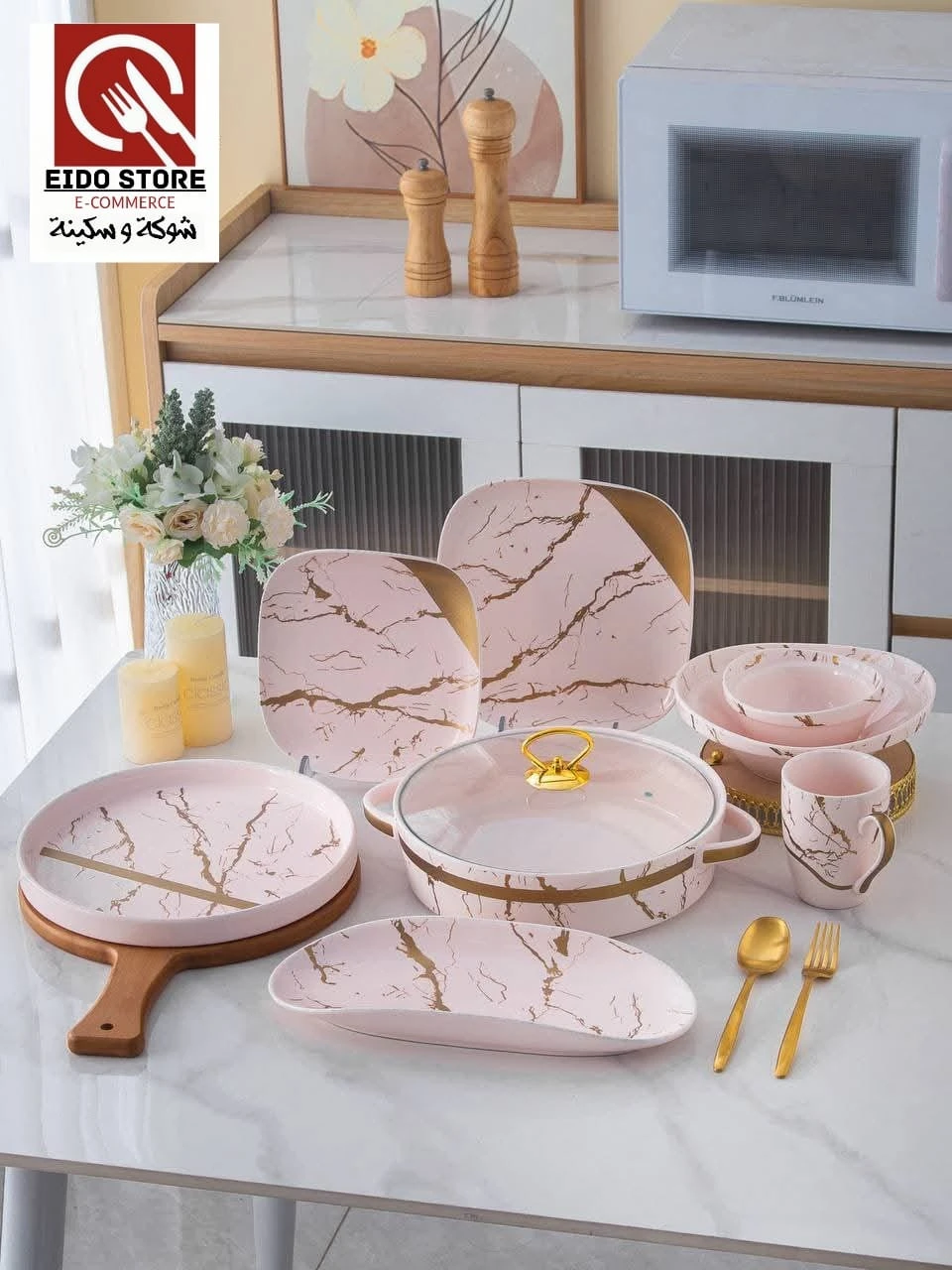 طقم عشاء فاخر بنقشة نقط ذهبية أنيقة، تصميم عصري يضفي لمسة فخامة وإشراقة على كل مناسبة. مصنوع من بورسلين عالي الجودة، آمن للاستخدام في الميكروويف وغسالة الأطباق، ليوفر لك تجربة عملية بجانب المظهر الراقي.