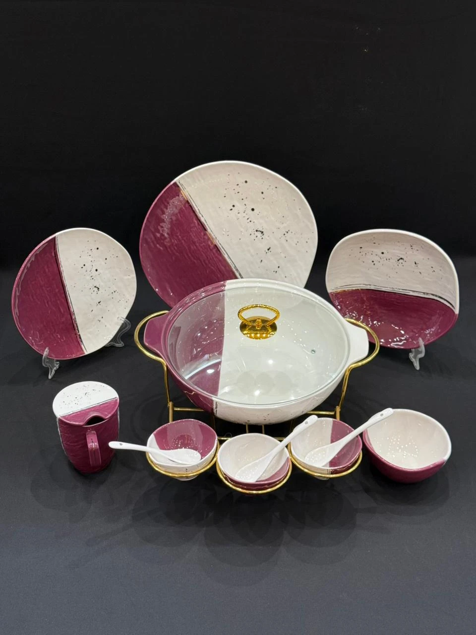 طقم عشاء فاخر ومتكامل بتصميم عصري يجمع بين الجمال والوظيفة، مثالي للعزومات والمناسبات الخاصة. مصنوع من بورسلين عالي الجودة، آمن للاستخدام في الميكروويف وغسالة الأطباق، ويوفّر لك تجربة تقديم أنيقة واحترافية.