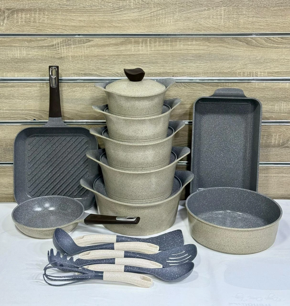 طقم حلل جرانيت كورى نيوفلام 24ق الطقم يتكون من :(1حله مقاس 28+1غطاء +1حله مقاس 24+1غطاء+1حله مقاس 22 +1غطاء+1حله مقاس 20+1غطاء +1حله مقاس 18+1غطاء+1مقلاية مقاس 22+1جريل مقاس 28 +1صينية مدورة مقاس28 +1صينية مستطيلة مقاس 26+6 قطع توزيع+ 4 ماسكات سيليكون)