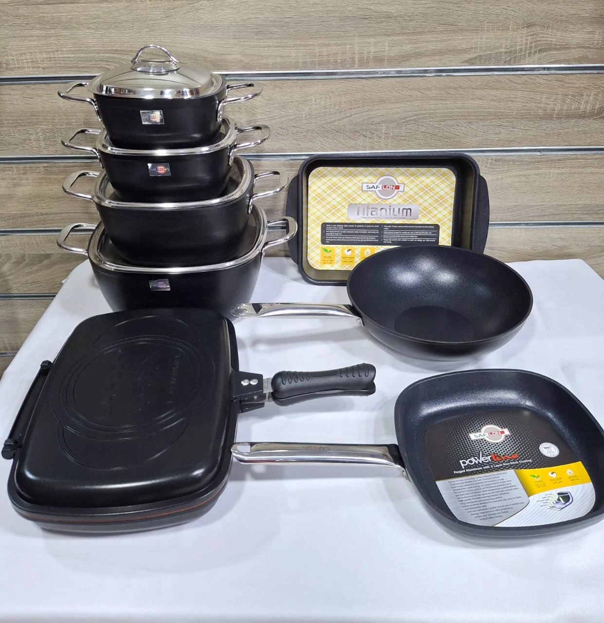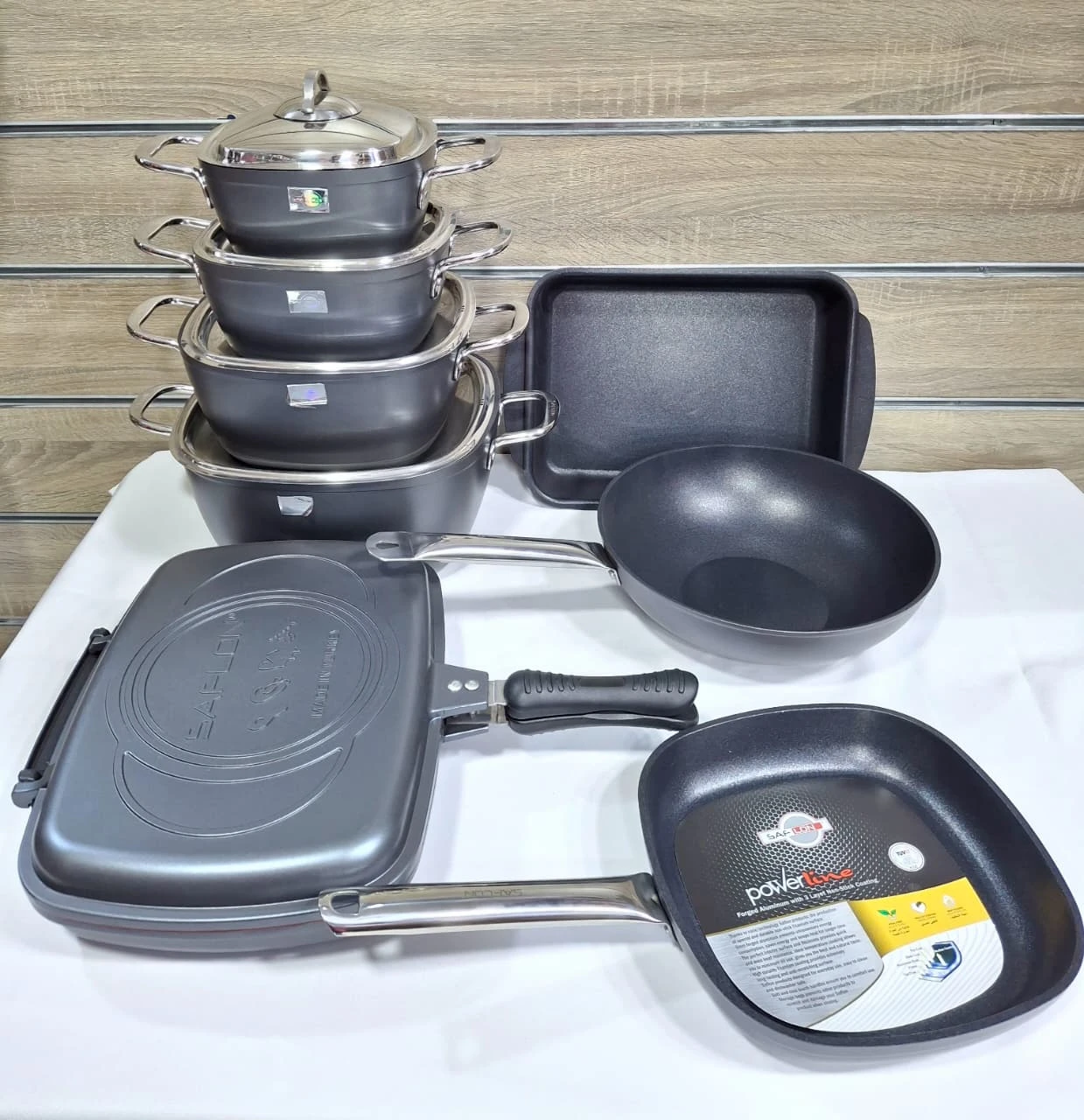 حله 18 سم + حله 20 سم + حله مقاس 24 سم + حله مقاس 28 سم +مقلاية مقاس 24 سم + مقلاية عميقه مقاس 28 سم + طاجن 31 سم + دبل جريل مقاس 36 سم