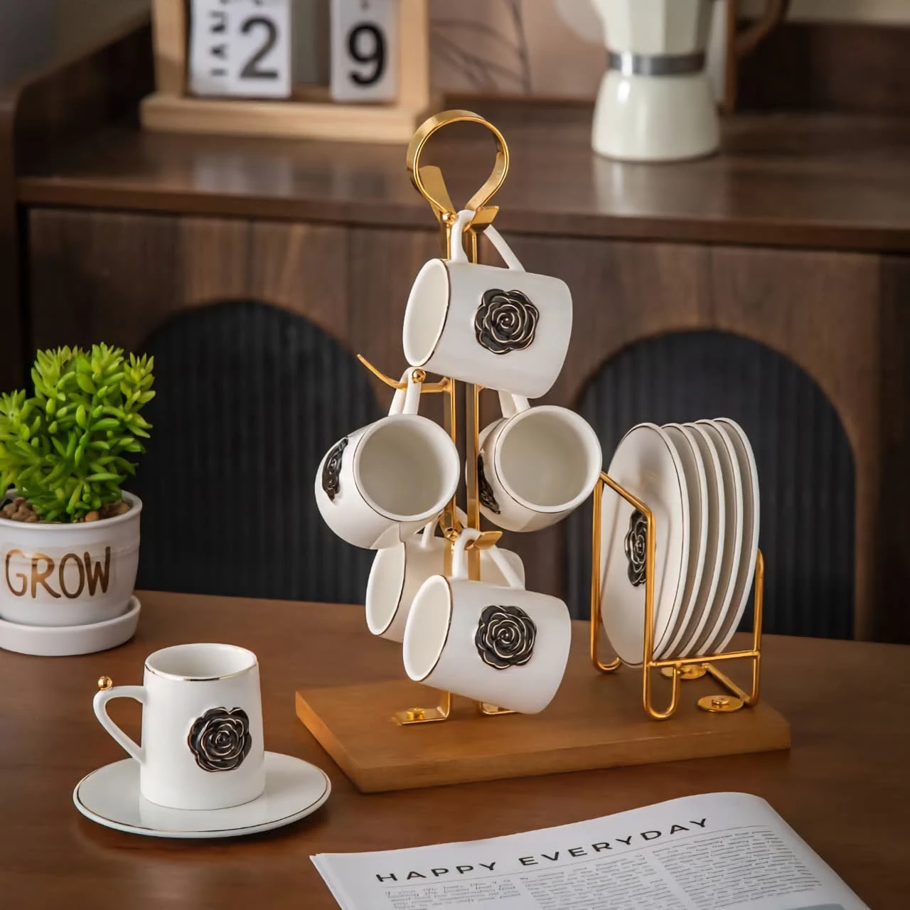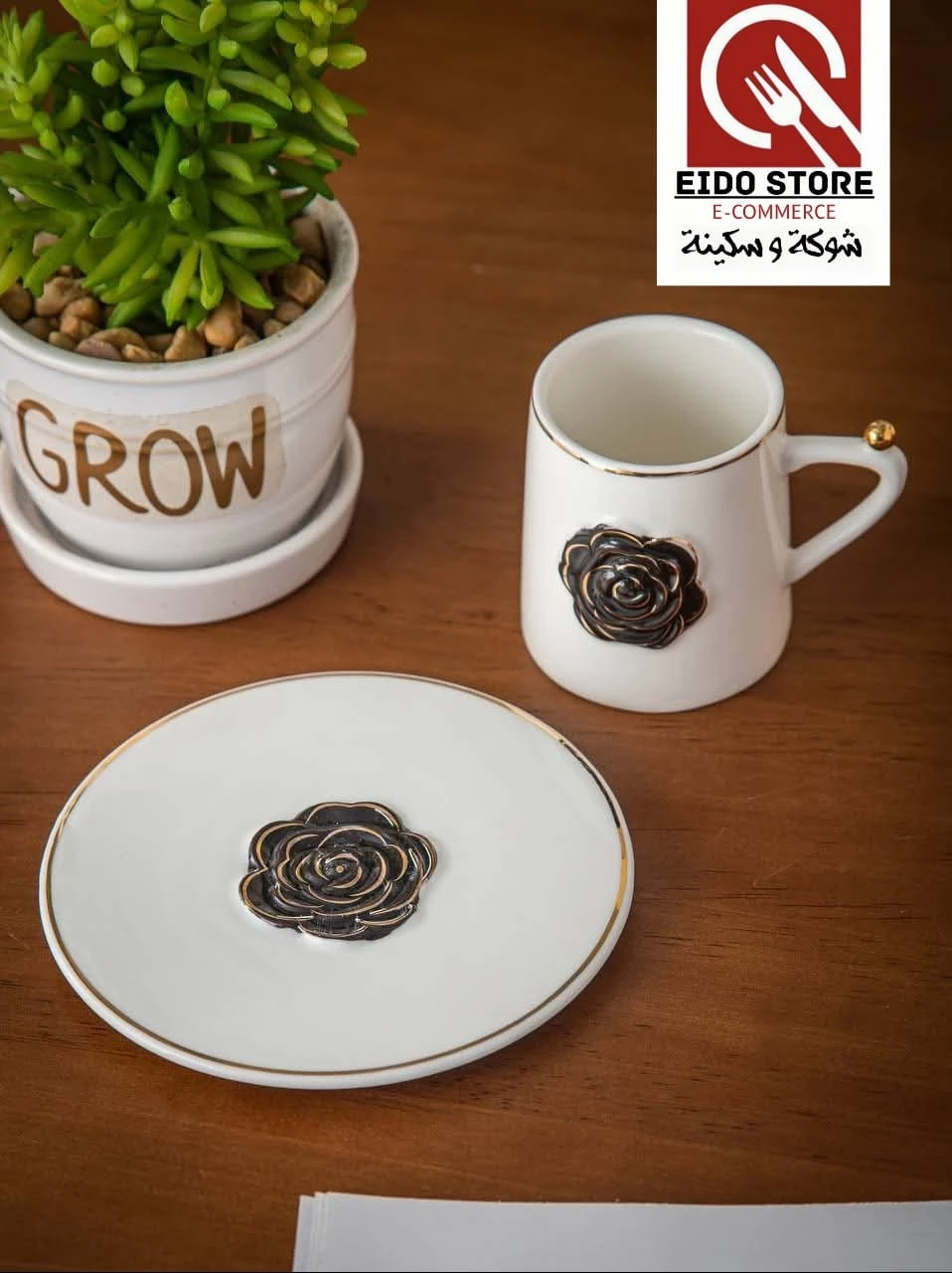 تصميم فاخر بنقشة ورد مجسمة ولمسة دهبية تضيف فخامة على كل فنجان