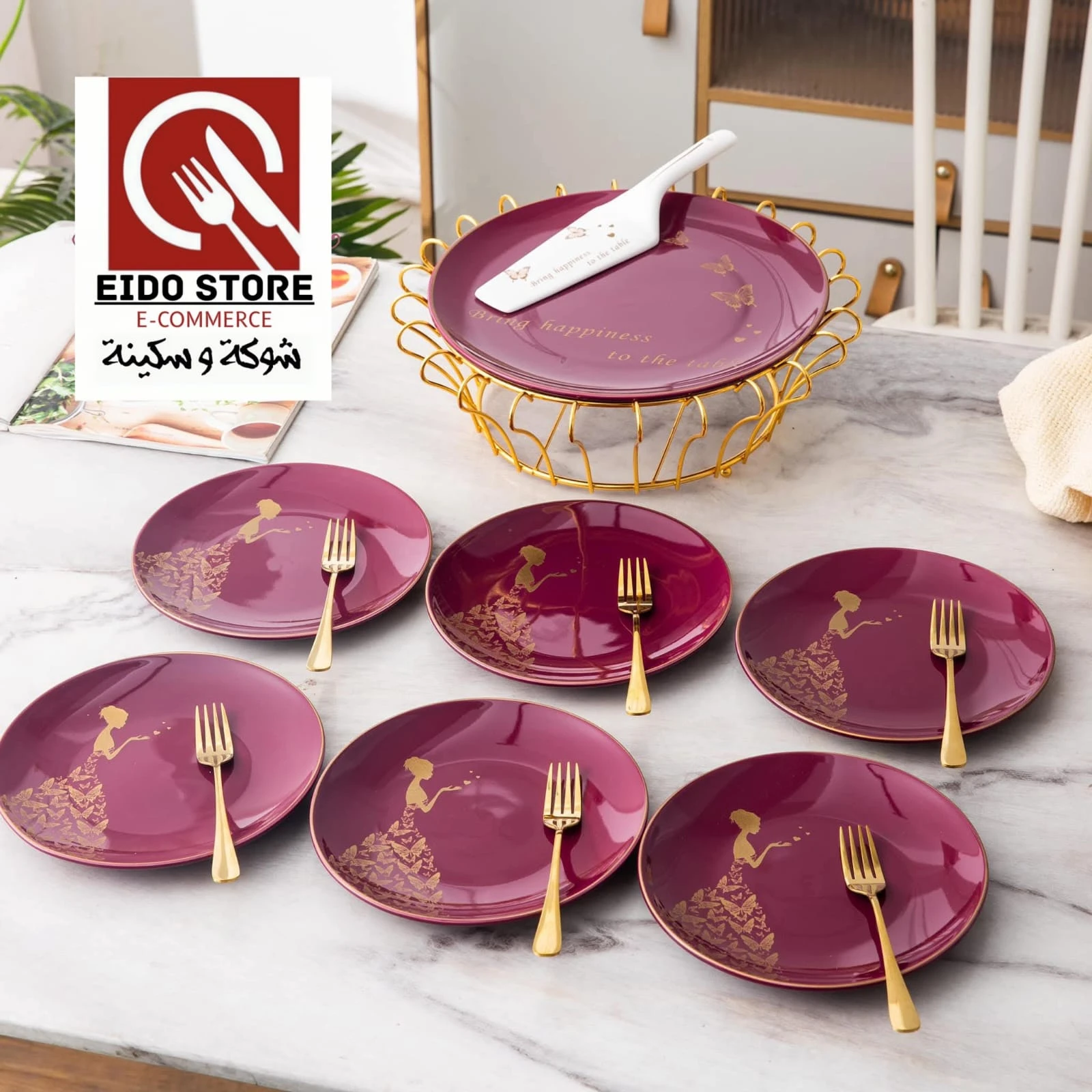 التكوين : 1 طبق تورته 1 ستاند معدن 6 طبق تقديم كبير 6 شوكه معدن 1 حامل 1 قطاعه كيك مُصنع من خامات عاليه الجوده