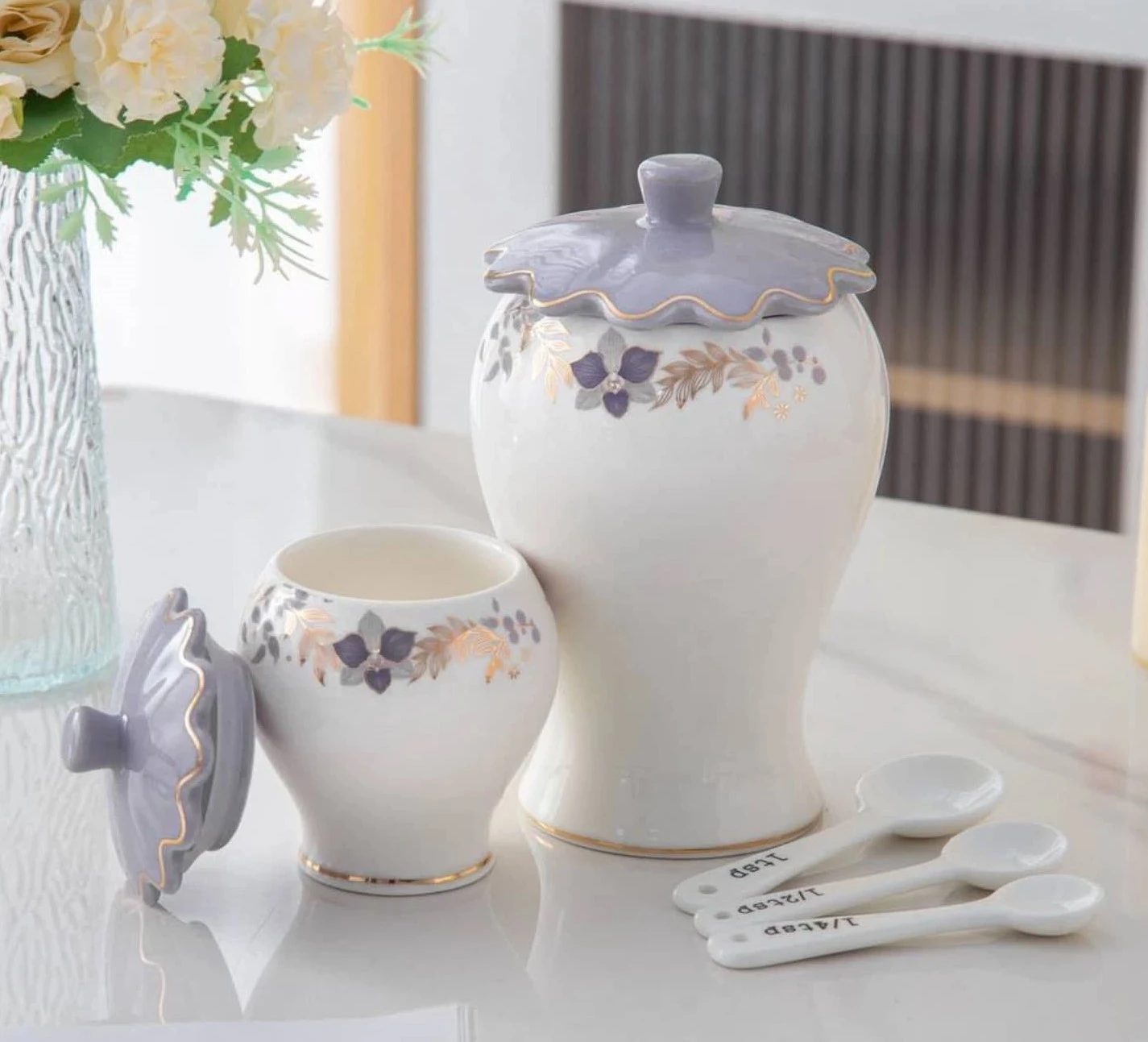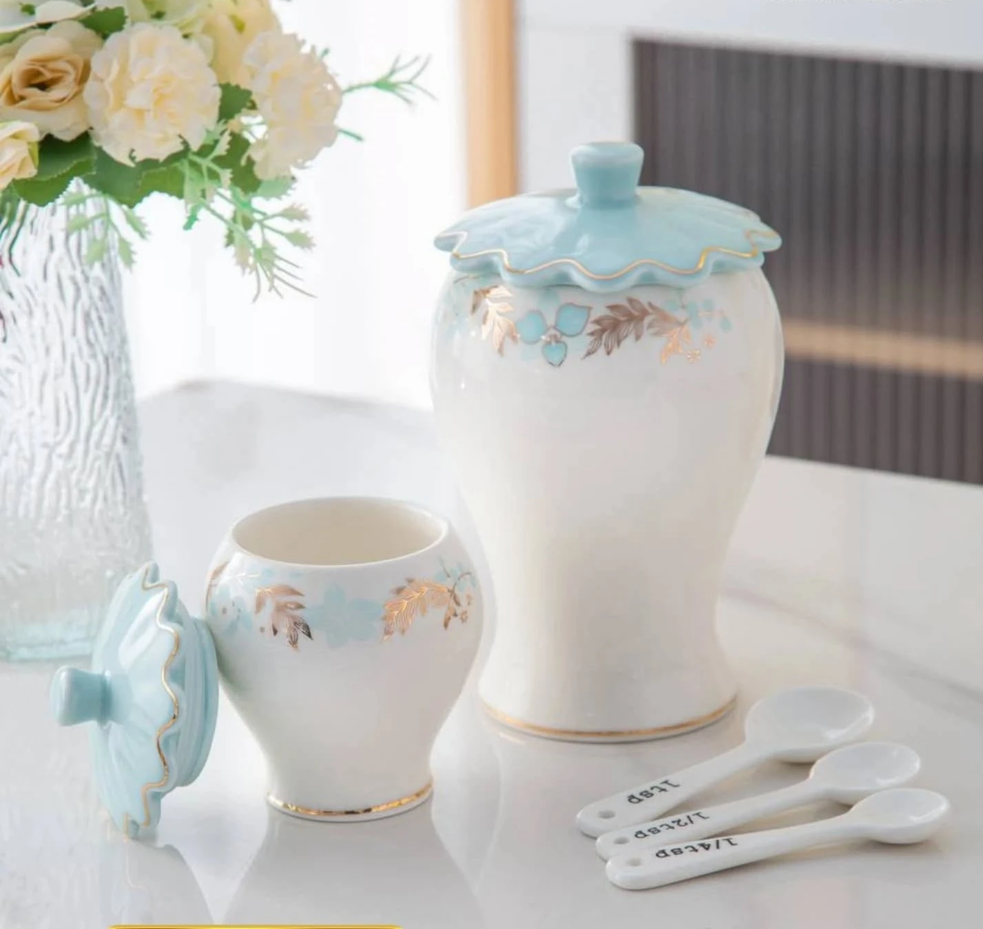 3 برطمان كبير بغطاء ( شاي - قهوه - سكر ) + 4 برطمان توابل وسط بغطاء + حامل معدني ذهبي فخم + ٣ معالق معيار