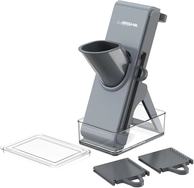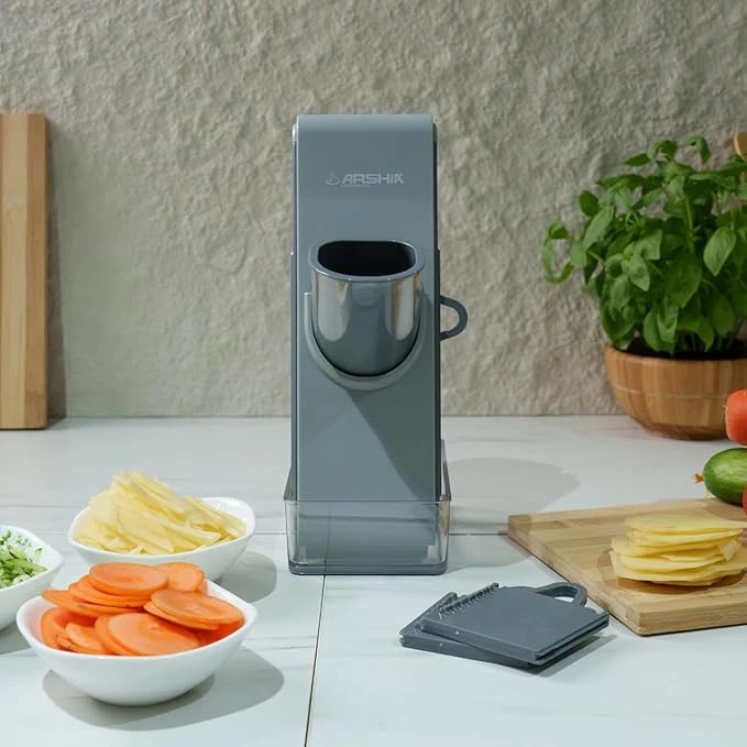 3 شفرات قابلة للتبديل لـ 4 أنماط للتقطيع: شريحة رفيعة، شريحة سميكة، جوليان، وعيدان الثقاب
