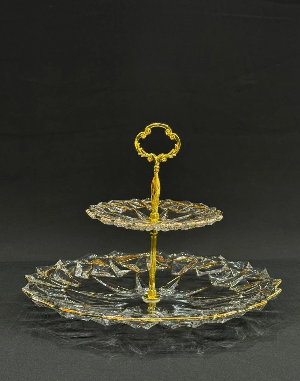 1. أضيفي لمسة من الفخامة إلى سفرتك مع هذه الشيّالة الرائعة المكونة من دورين مصنوعة من زجاج كريستال شفاف عالي الجودة بحشو مزخرفة باللون الذهبي اللامع. تتميز بتصميم أنيق عملي لتقديم الكحك والبسكويت والبيتي فور والحلويات الشرقية والغربية في العزومات والمناسبات والأعياد.