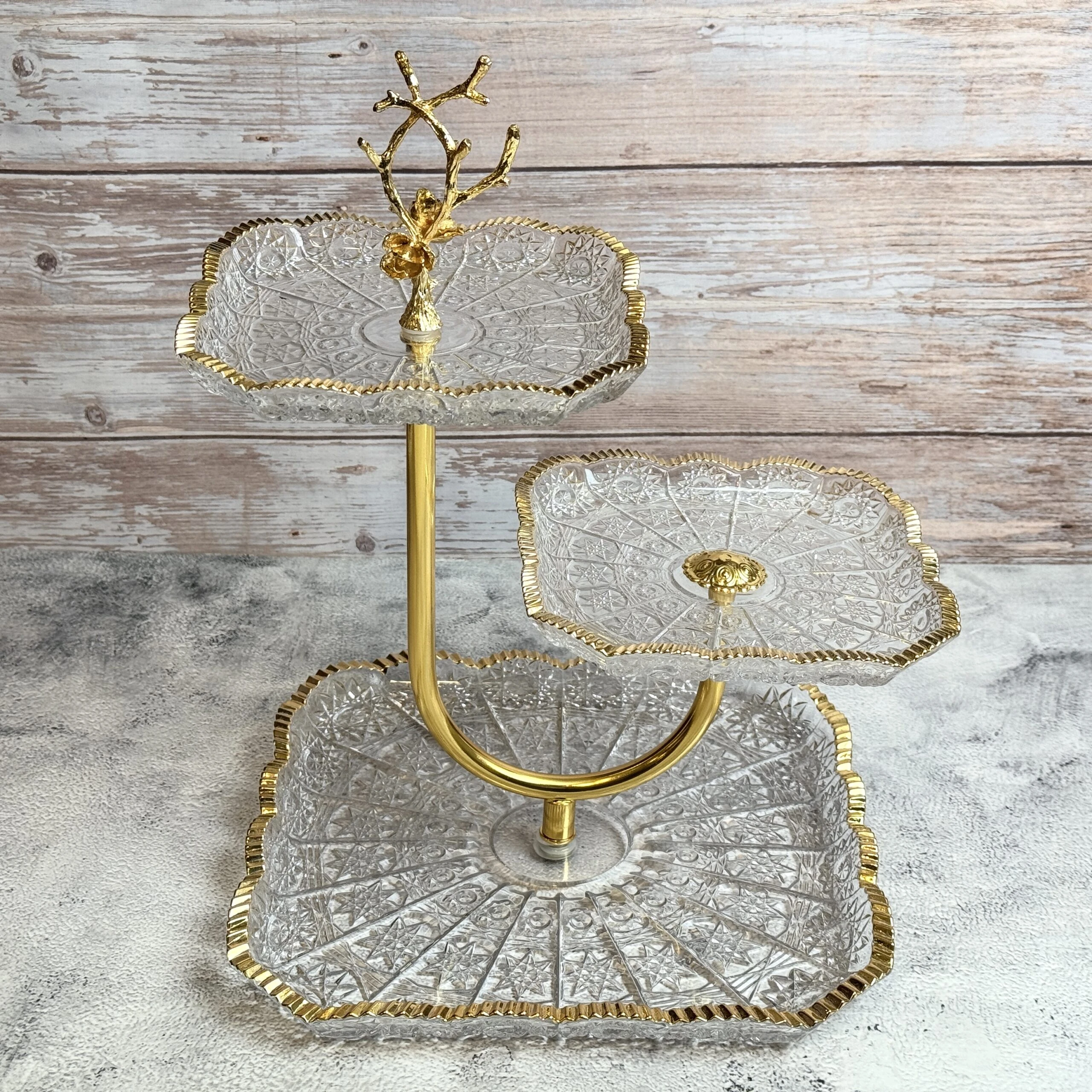 2. شيّالة كحك ثلاثية دور زجاج وكريستال بفريم ذهبي فاخر