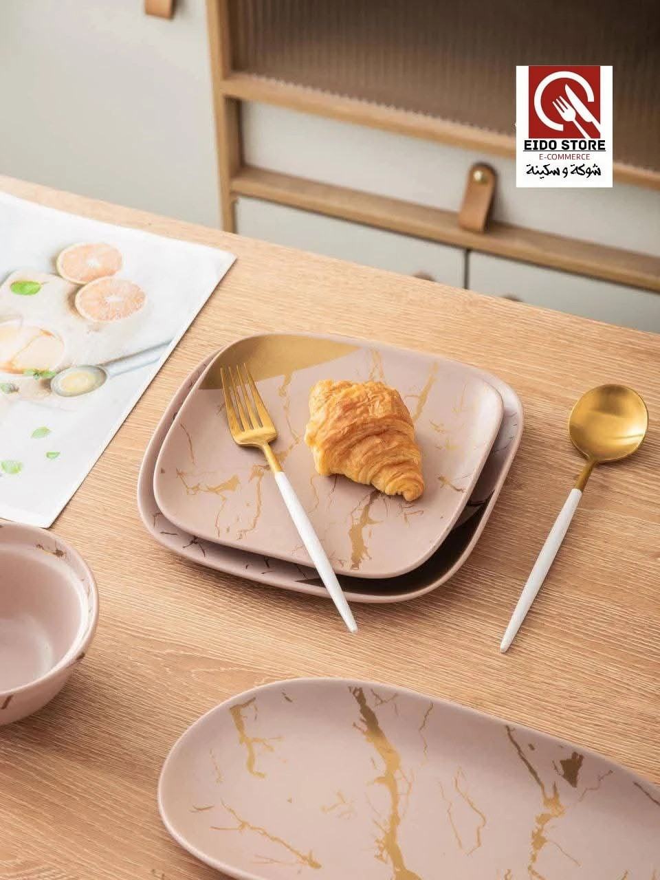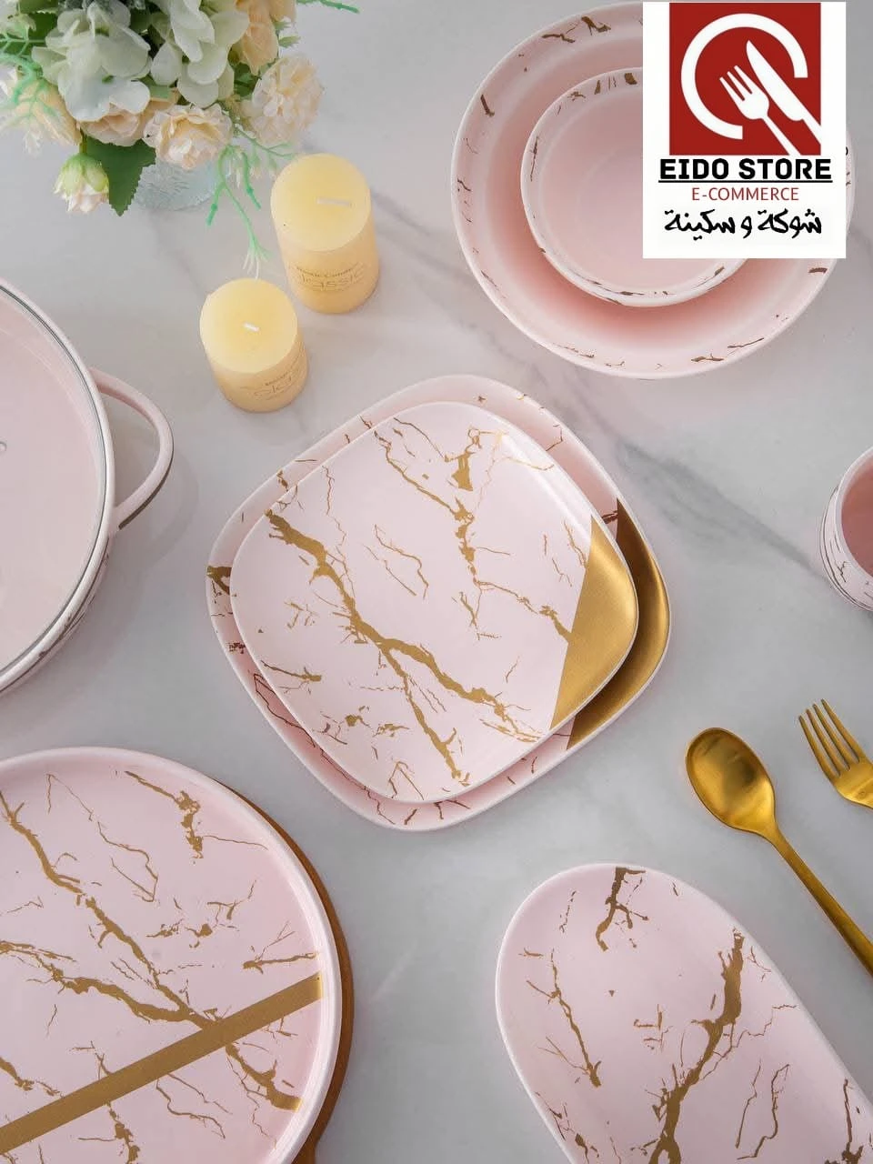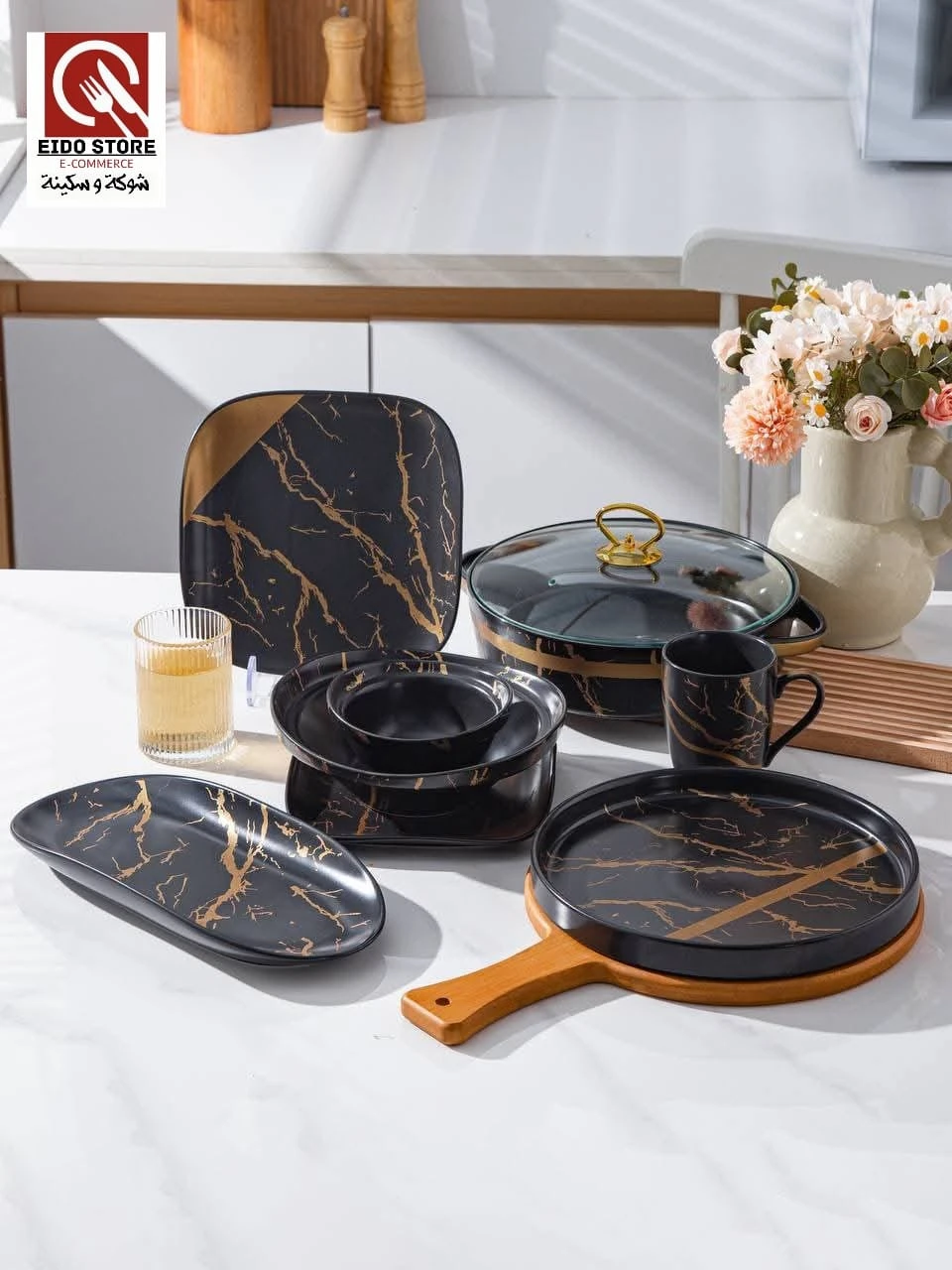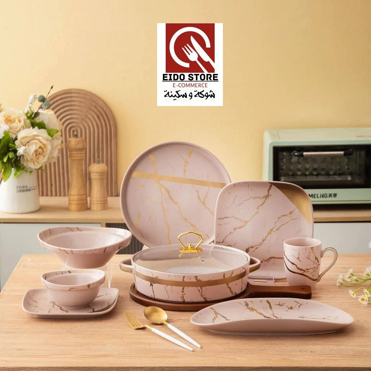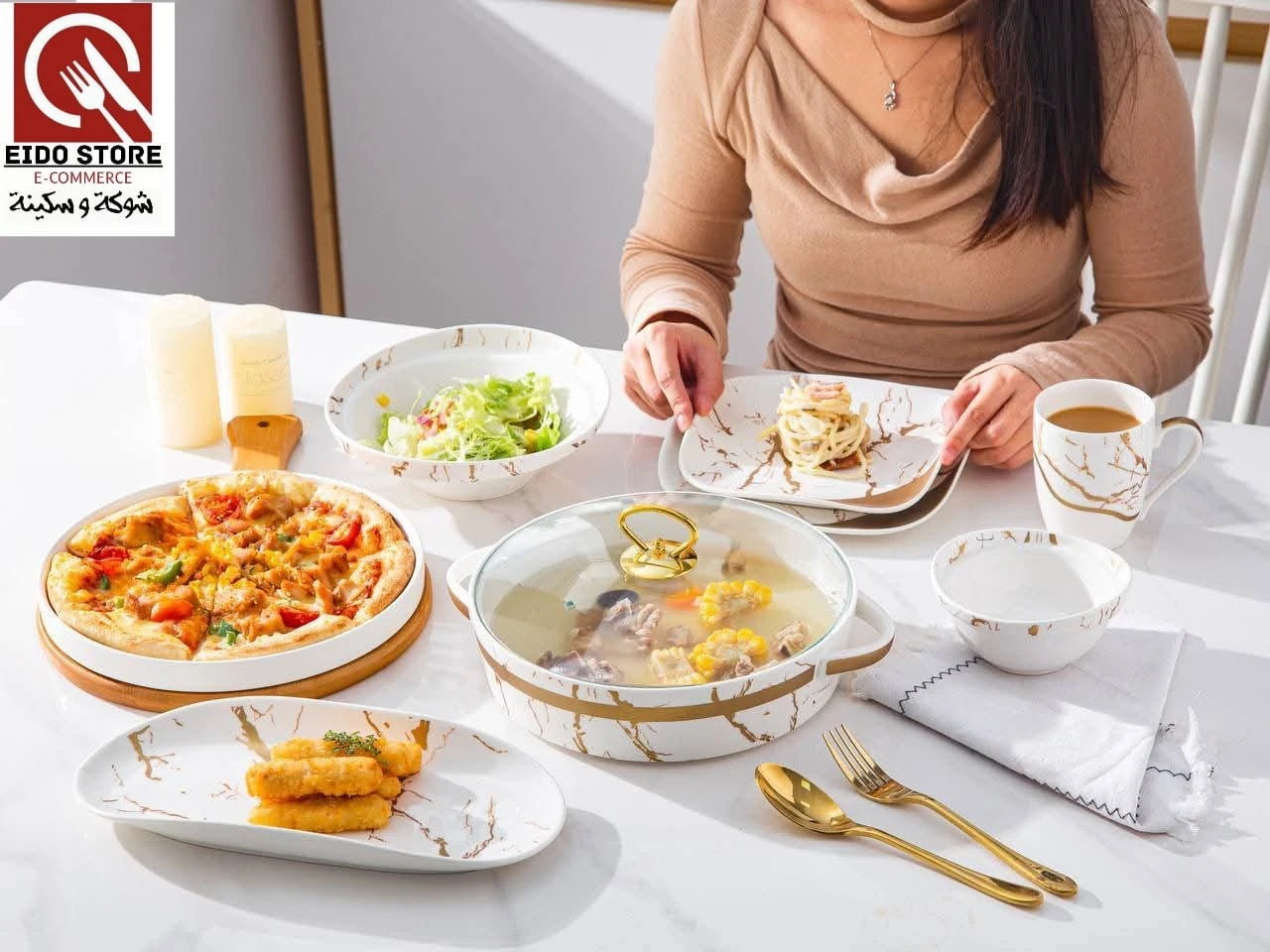 طقم عشاء فاخر بنقشة نقط ذهبية أنيقة، تصميم عصري يضفي لمسة فخامة وإشراقة على كل مناسبة. مصنوع من بورسلين عالي الجودة، آمن للاستخدام في الميكروويف وغسالة الأطباق، ليوفر لك تجربة عملية بجانب المظهر الراقي.