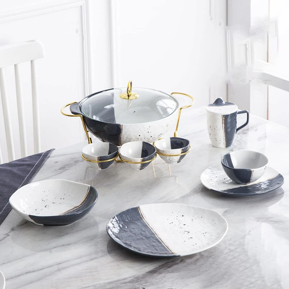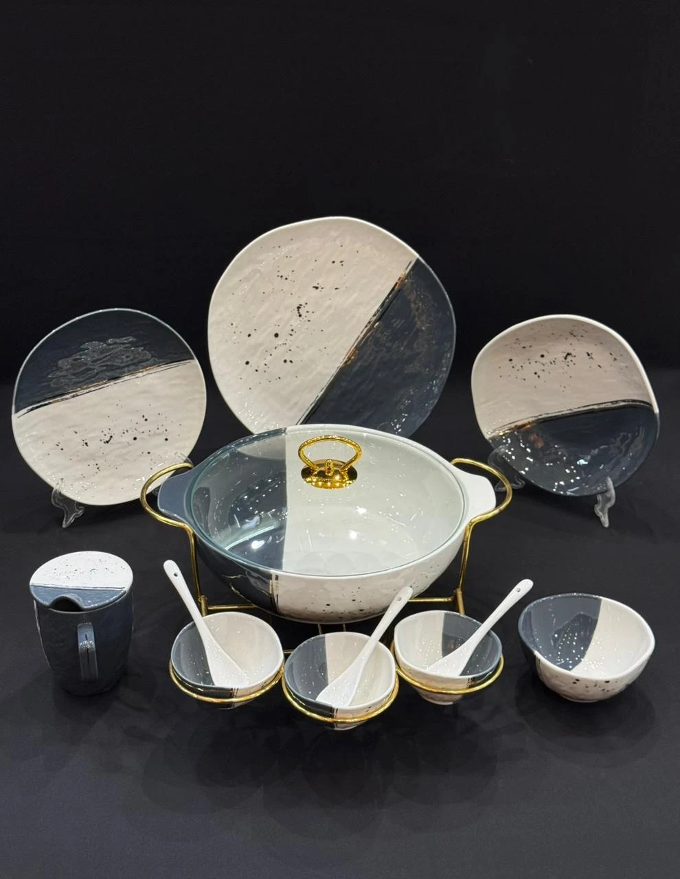 طقم عشاء فاخر ومتكامل بتصميم عصري يجمع بين الجمال والوظيفة، مثالي للعزومات والمناسبات الخاصة. مصنوع من بورسلين عالي الجودة، آمن للاستخدام في الميكروويف وغسالة الأطباق، ويوفّر لك تجربة تقديم أنيقة واحترافية.