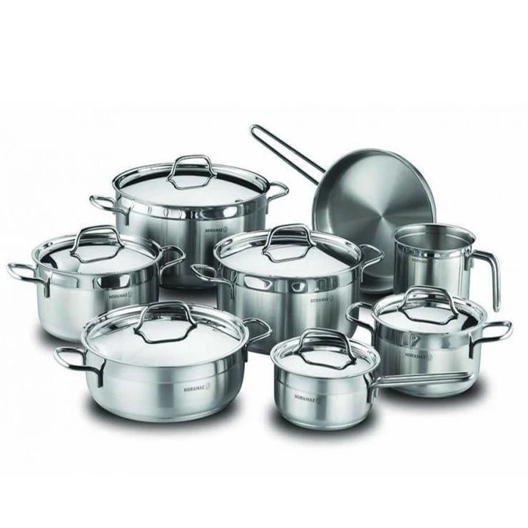 طقم حلل استانلس استيل ألفا جراند من كوركماز مكون من 14 قطعة، يجمع بين الجودة العالية والتصميم العصري ليمنح مطبخك لمسة فاخرة وعملية في نفس الوقت. مصنوع من استانلس ستيل 18/10 الممتاز، مما يضمن لك متانة تدوم ولمعان لا يبهت مع الاستخدام اليومي.