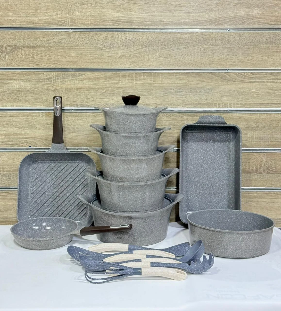 طقم حلل جرانيت كورى نيوفلام 24ق الطقم يتكون من :(1حله مقاس 28+1غطاء +1حله مقاس 24+1غطاء+1حله مقاس 22 +1غطاء+1حله مقاس 20+1غطاء +1حله مقاس 18+1غطاء+1مقلاية مقاس 22+1جريل مقاس 28 +1صينية مدورة مقاس28 +1صينية مستطيلة مقاس 26+6 قطع توزيع+ 4 ماسكات سيليكون)