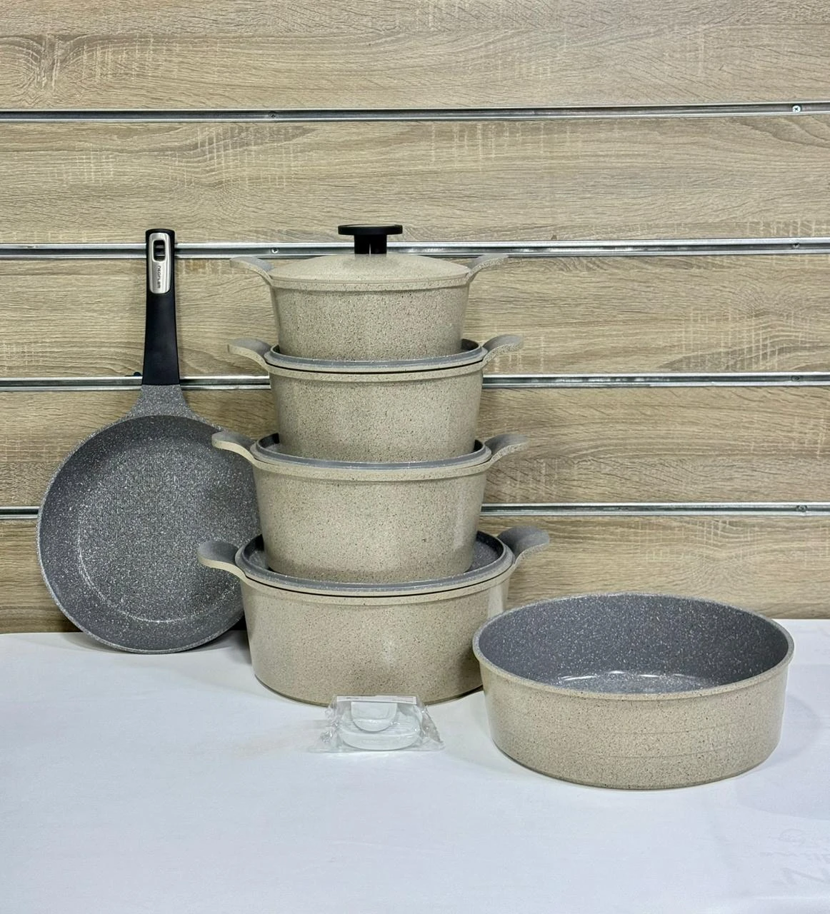 طقم عملي بتصميم مضلع أنيق ولون بيج راقٍ، مصنوع من خامة الجيرانيت الصحية والمقاومة للالتصاق. يوفر توزيع حراري ممتاز وسهولة في التنظيف، ليمنحك تجربة طهي متكاملة.