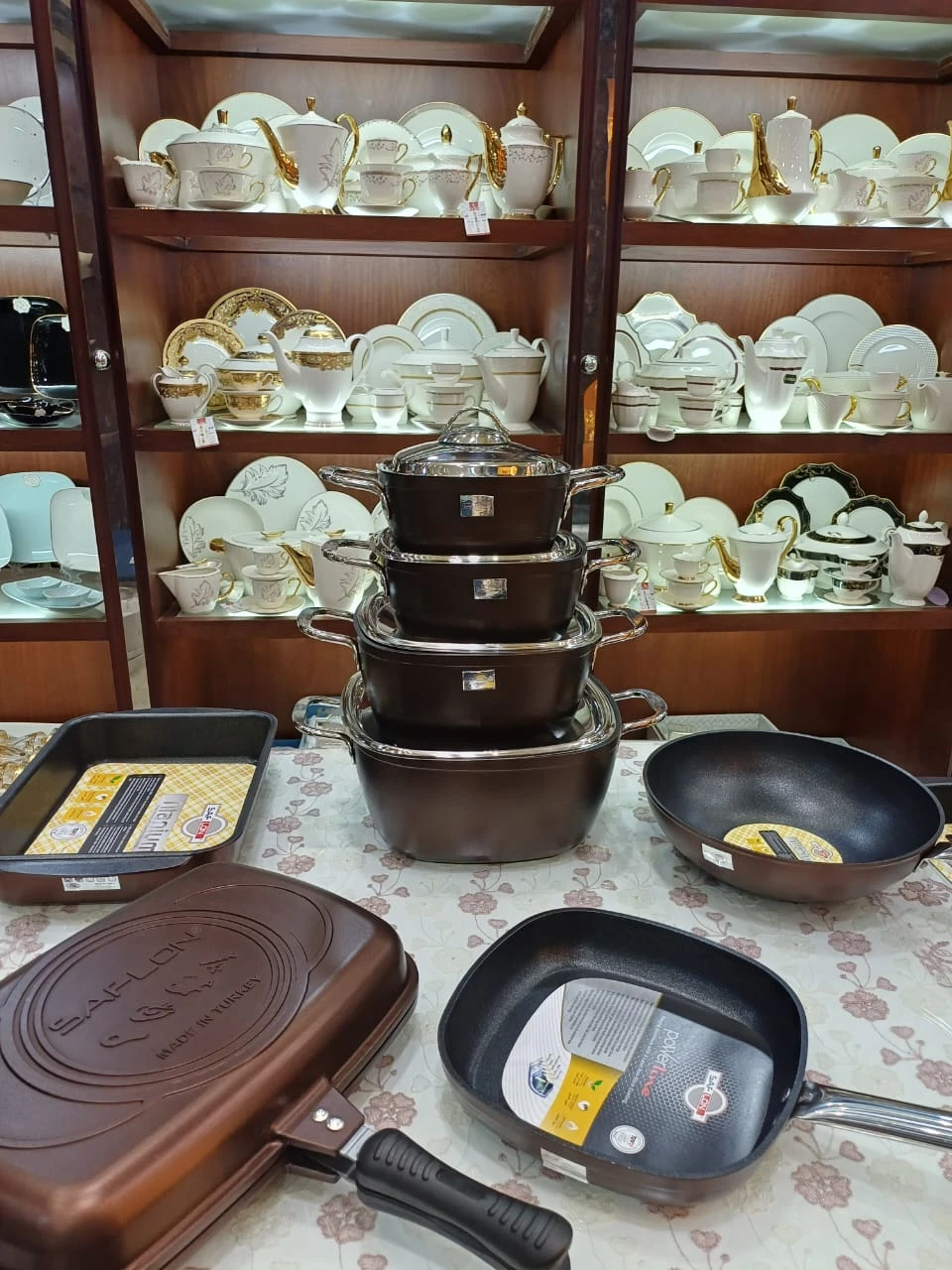 حله 18 سم + حله 20 سم + حله مقاس 24 سم + حله مقاس 28 سم +مقلاية مقاس 24 سم + مقلاية عميقه مقاس 28 سم + طاجن 31 سم + دبل جريل مقاس 36 سم
