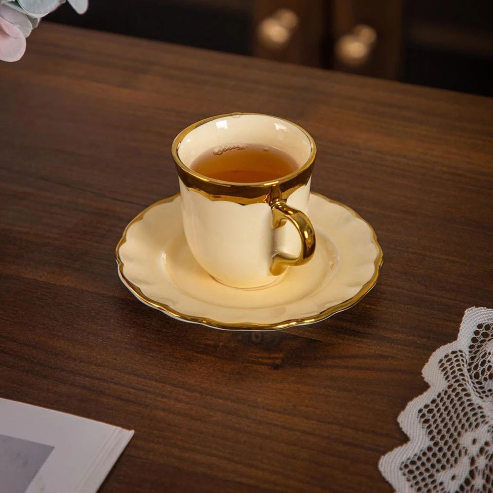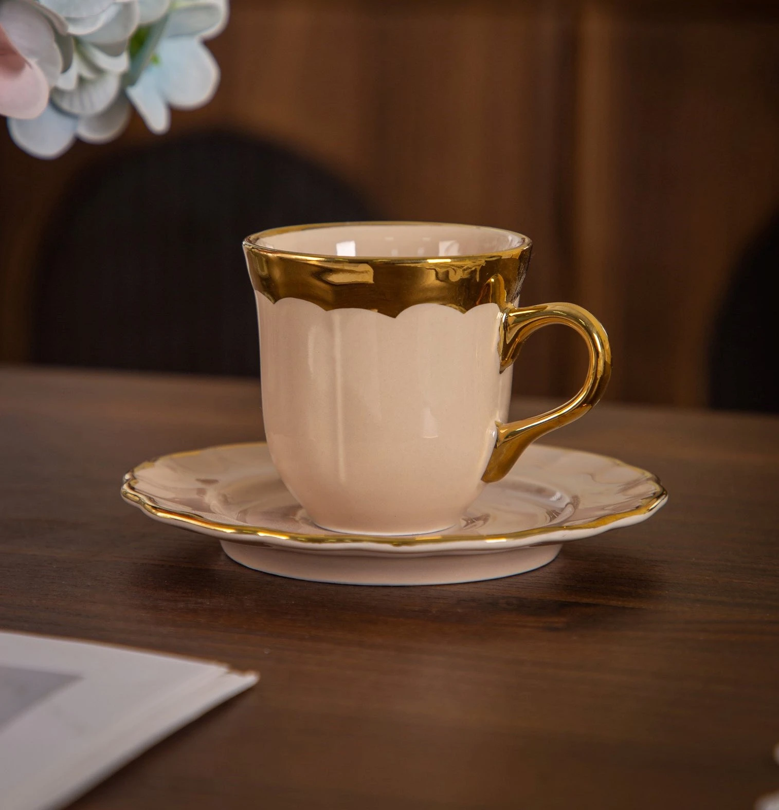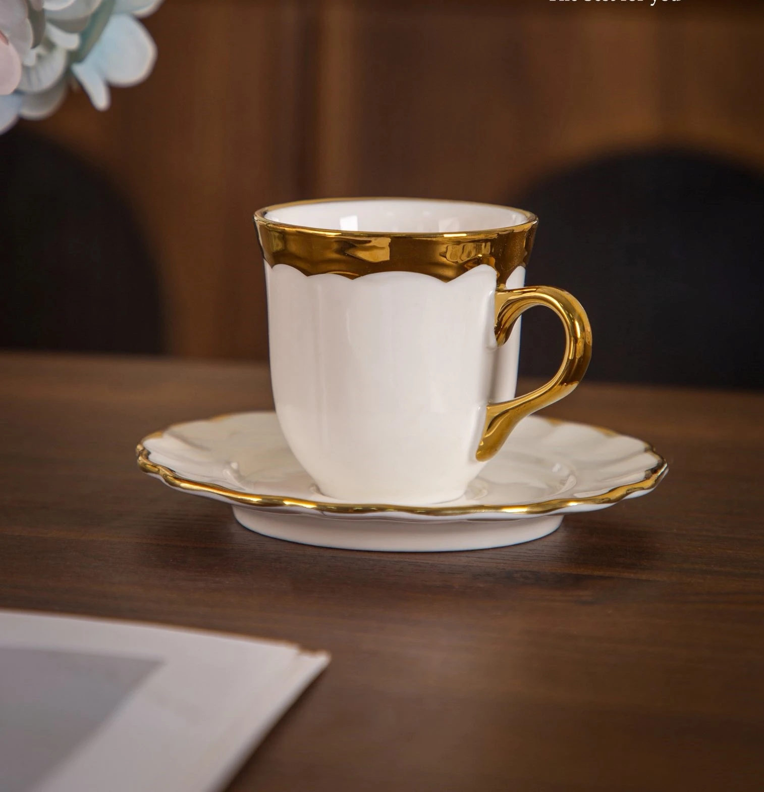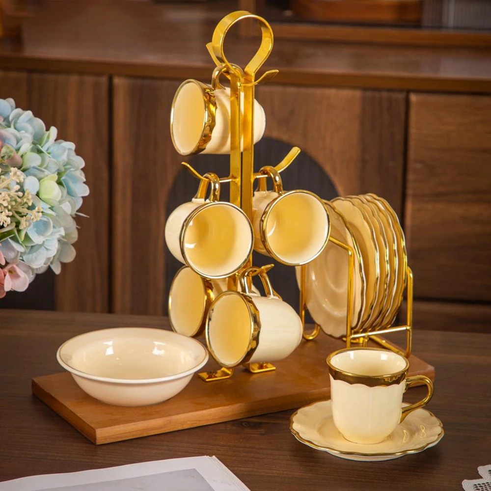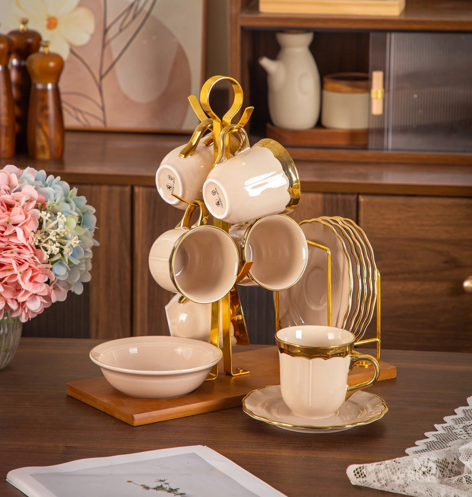 1. طقم القهوة بالحامل هو اختيار مثالي لكل من يبحث عن الأناقة والعملية في آن واحد. يتميز الطقم بتصميم راقٍ يجمع بين الهدوء والفخامة، مع حامل معدني ذهبي يُسهّل تنظيم الطقم ويمنحه مظهرًا جذّابًا يناسب جميع ديكورات المنزل.