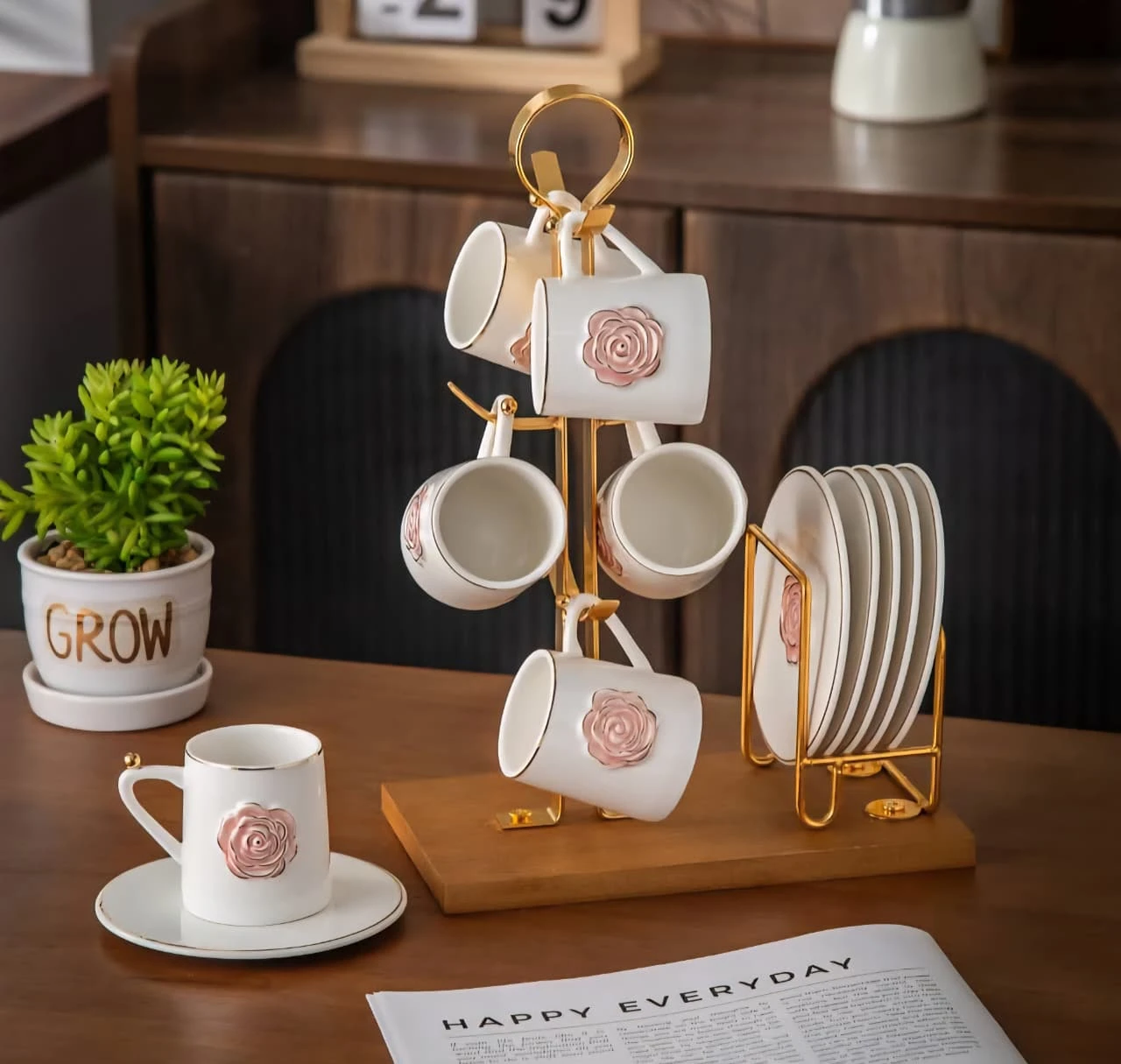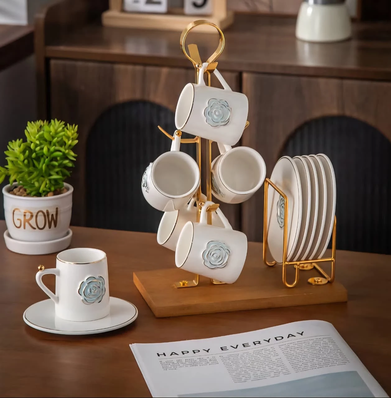 تصميم فاخر بنقشة ورد مجسمة ولمسة دهبية تضيف فخامة على كل فنجان