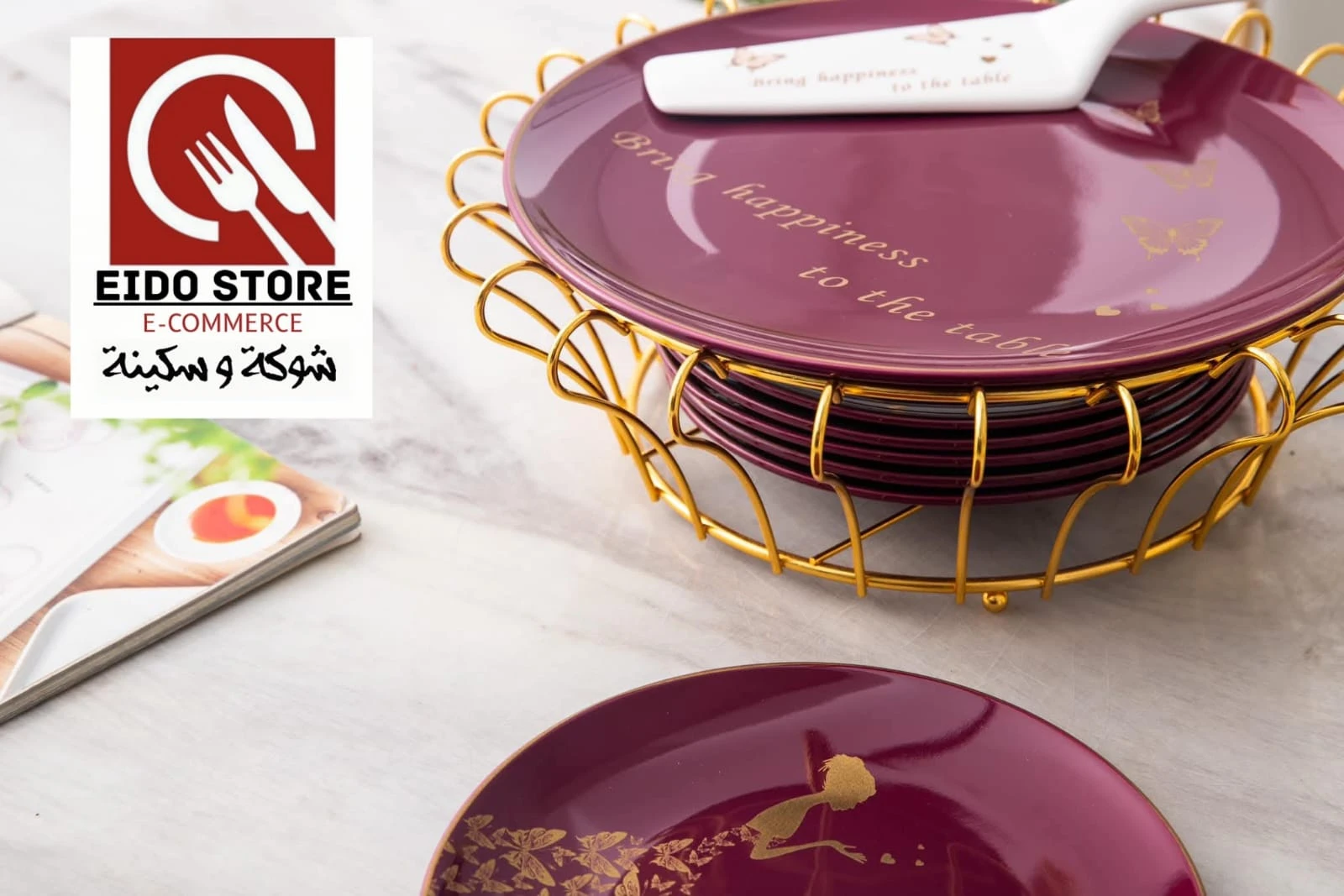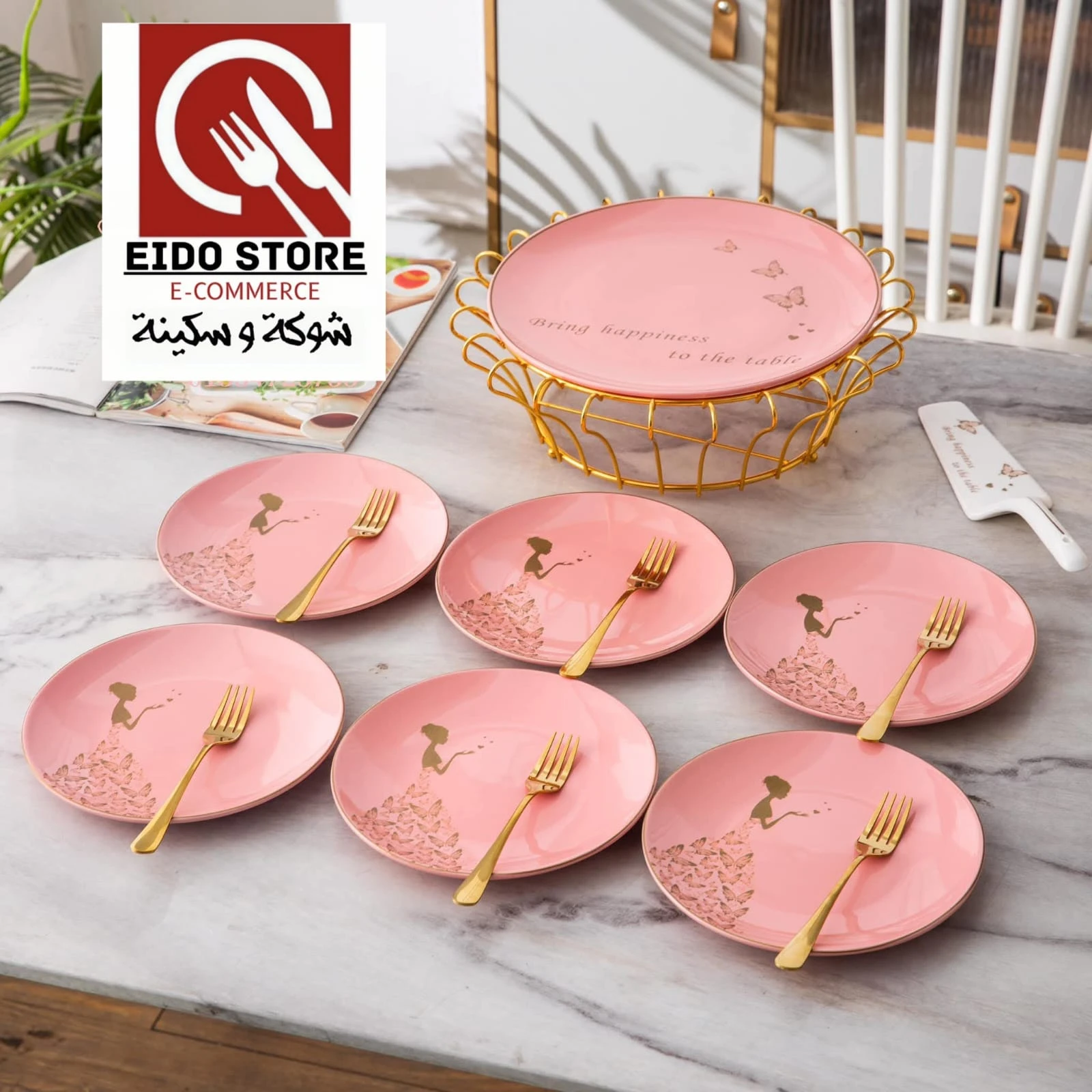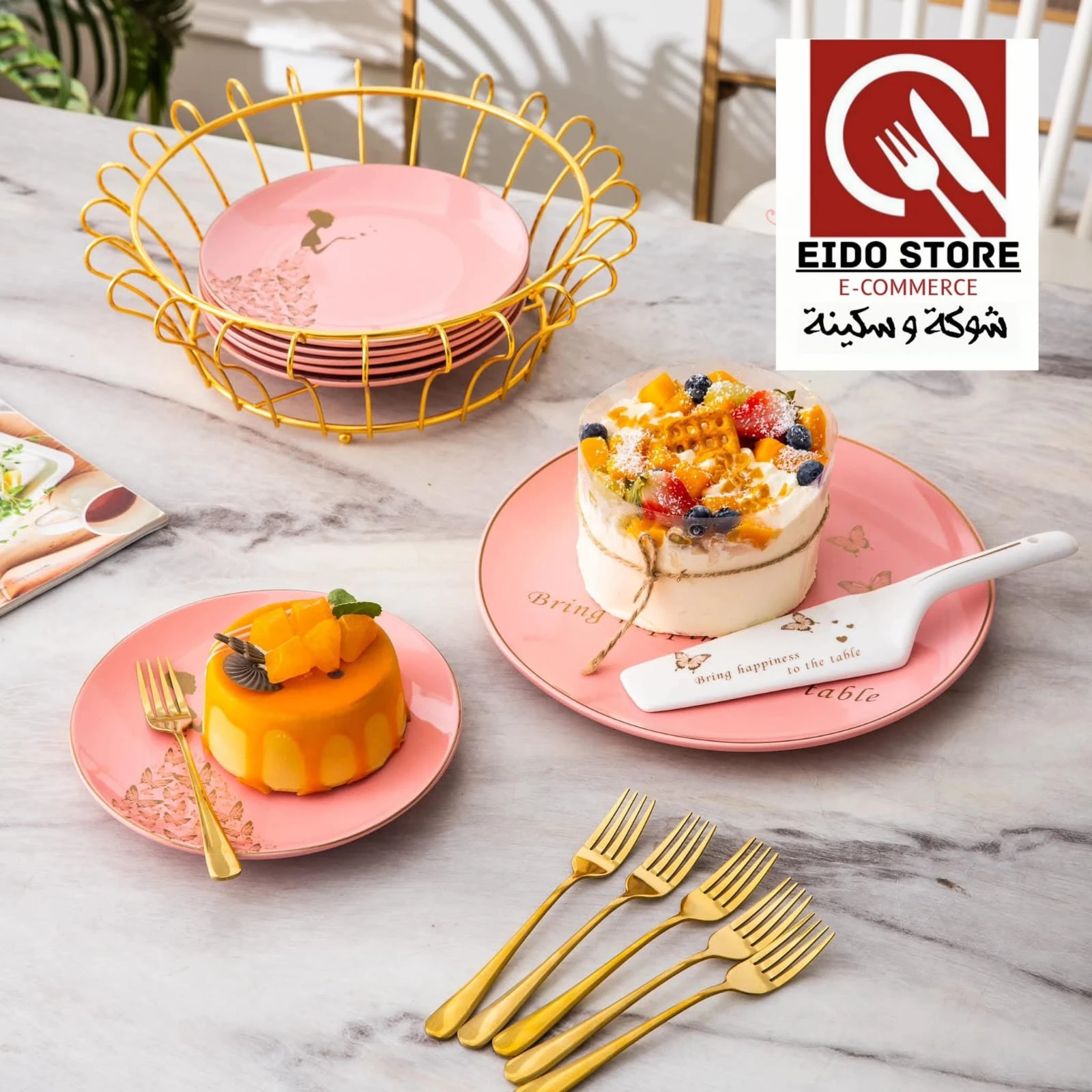 التكوين : 1 طبق تورته 1 ستاند معدن 6 طبق تقديم كبير 6 شوكه معدن 1 حامل 1 قطاعه كيك مُصنع من خامات عاليه الجوده