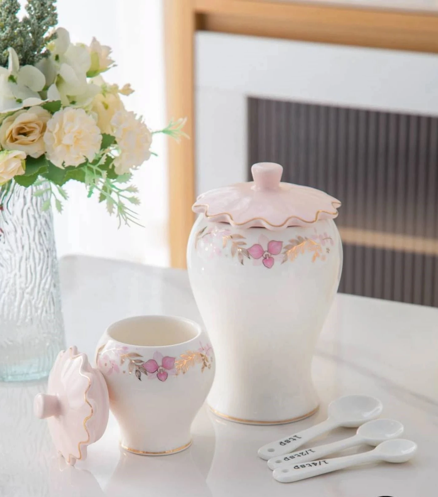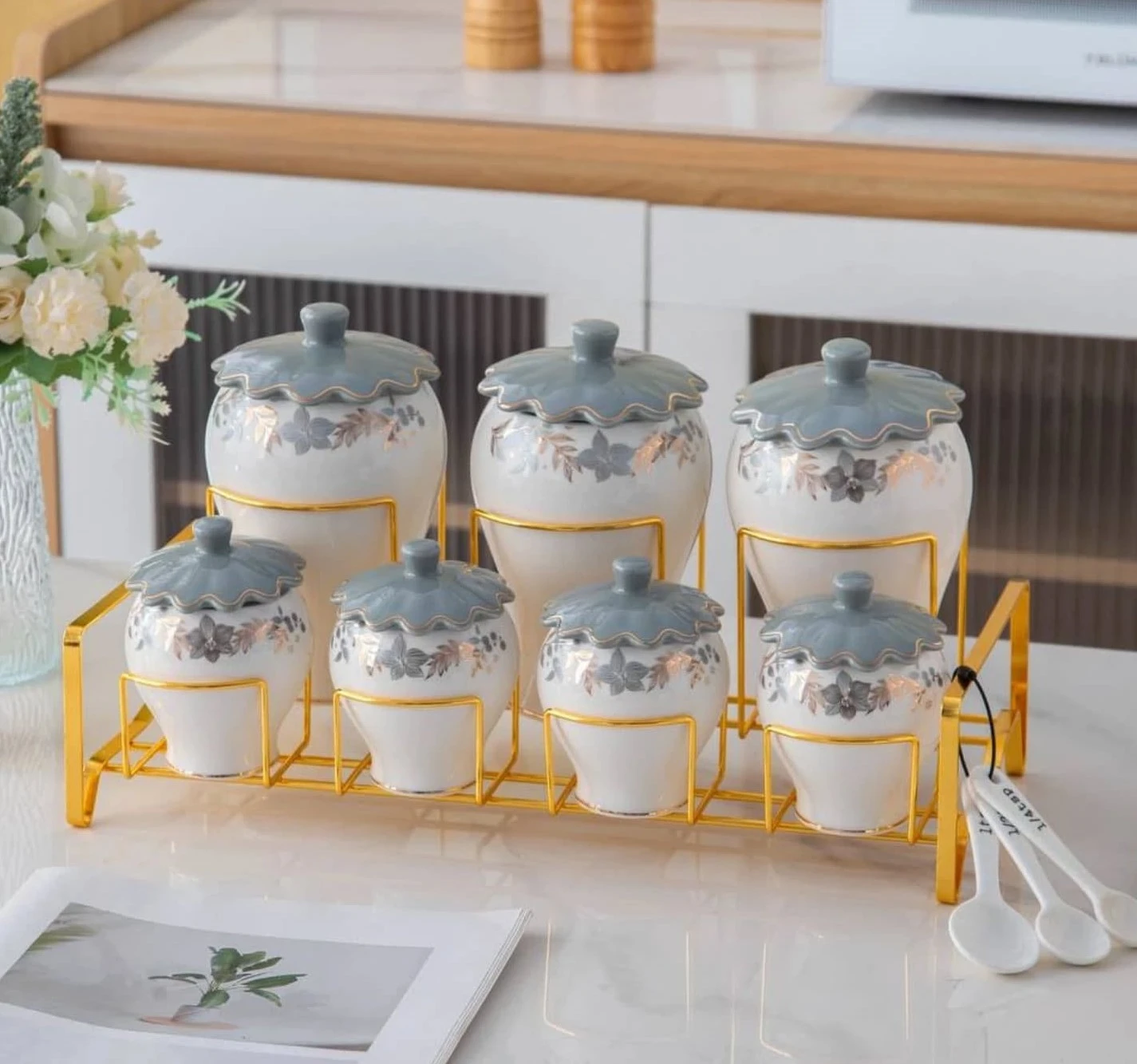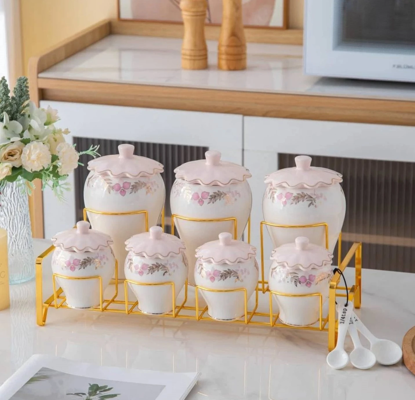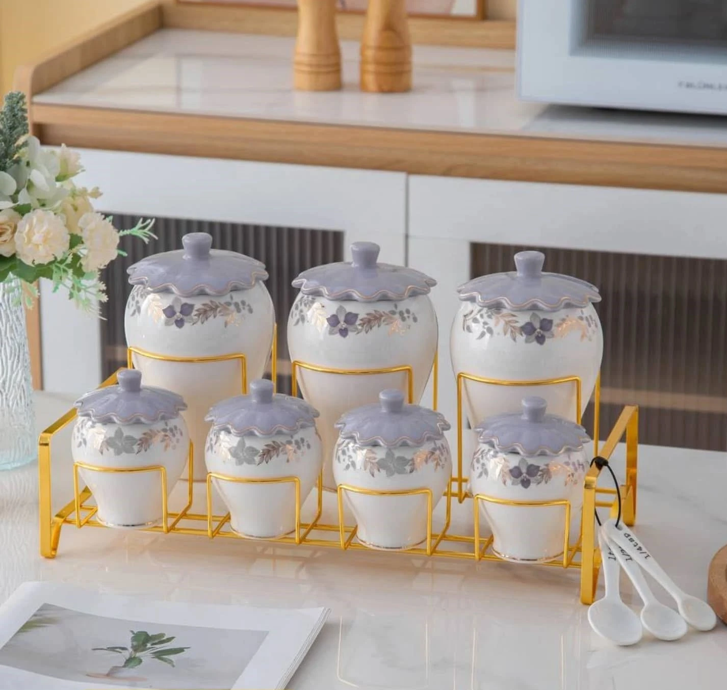 3 برطمان كبير بغطاء ( شاي - قهوه - سكر ) + 4 برطمان توابل وسط بغطاء + حامل معدني ذهبي فخم + ٣ معالق معيار